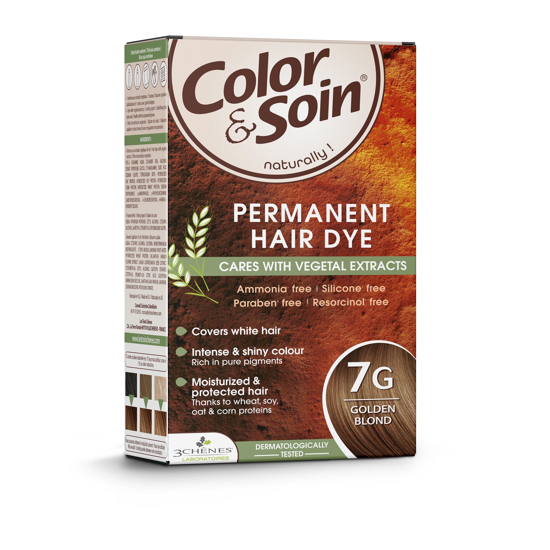 COLOR & SOIN ammoniaagivaba juuksevärv 7G Golden Blond – õrn kauapüsiv juuksevärv taimeekstraktidega, sobib kõikidele juuksetüüpidele ja tundlikule peanahale. Dermatoloogiliselt testitud valem ilma ammoniaagi, silikooni ja muude agressiivsete aineteta tagab intensiivse ja kauapüsiva värvi, niisutab, toidab juukseid ning säilitab nende loomuliku sileduse ja elastsuse. Värvib hallid juuksed juba esimesel värvimisel.