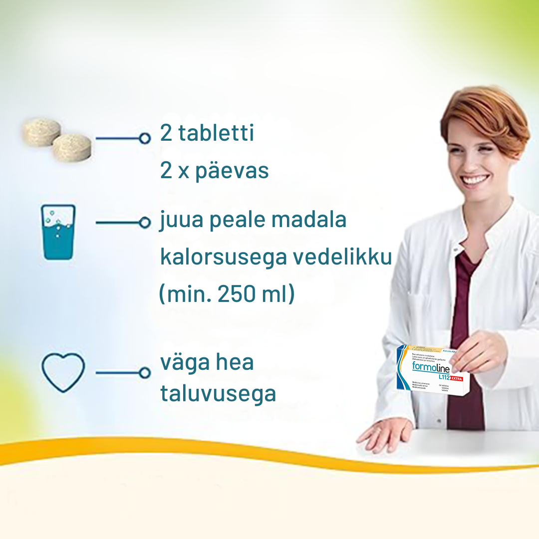 Ärge tablette närige, jooge palju madala kalorsusega vedelikku (vähemalt 250 ml), et need jõuaksid maosse. Kuna formoline L112 EXTRA sisaldab palju kiudaineid, veenduge, et tarbiksite piisavalt vedelikku – vähemalt 2 liitrit päevas.
