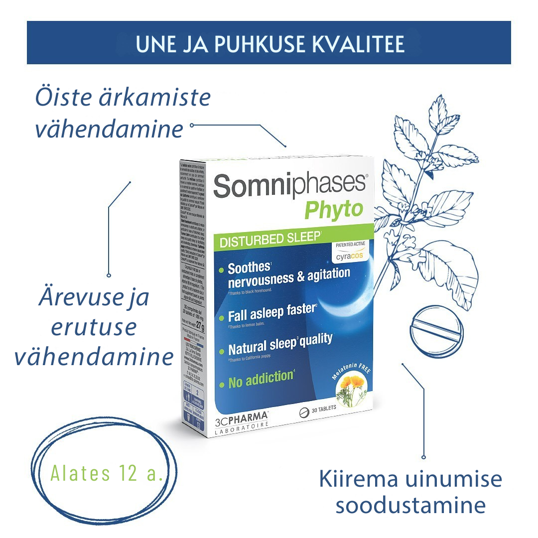 3C PHARMA Somniphases Phyto – looduslik kompleks une ja lõõgastuse heaks. Patenteeritud Cyracos® sidrunmelissi ekstrakt, California moon, lavendliõli, magneesium ja B6-vitamiin aitavad säilitada kvaliteetset und, lõõgastuda ja vähendada väsimust. Ei tekita sõltuvust, sobib kasutamiseks alates 12. eluaastast.