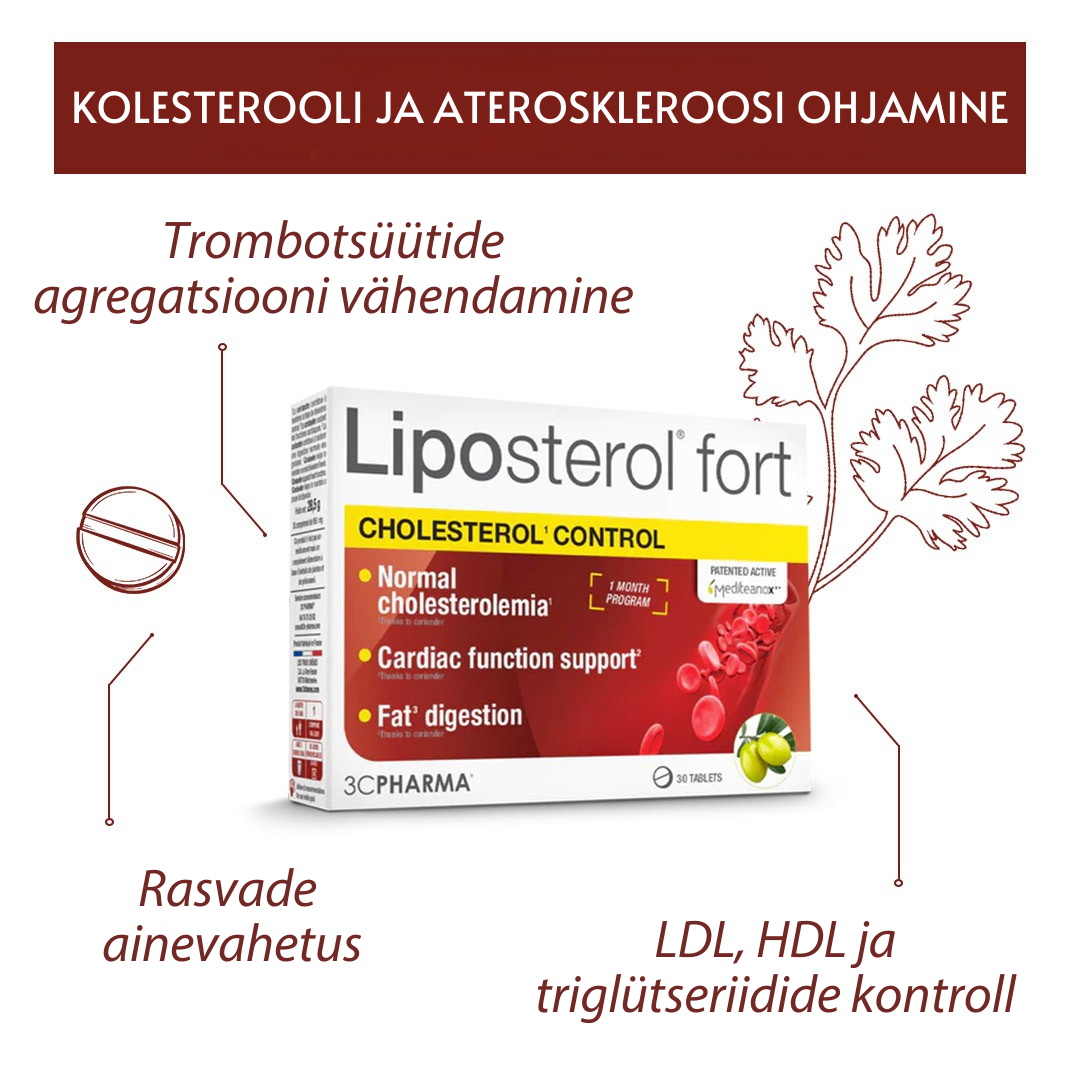 3C PHARMA Liposterol Fort on toidulisand, mis aitab säilitada normaalset vere kolesteroolitaset, südame-veresoonkonna funktsiooni ja rasvade ainevahetust. Koostisainete hulka kuuluvad koriandri ja bergamoti ekstraktid ning oliiviõli polüfenoolid, mis aitavad säilitada normaalset lipiidide ainevahetust ja kaitsta rakke oksüdatiivsete kahjustuste eest.