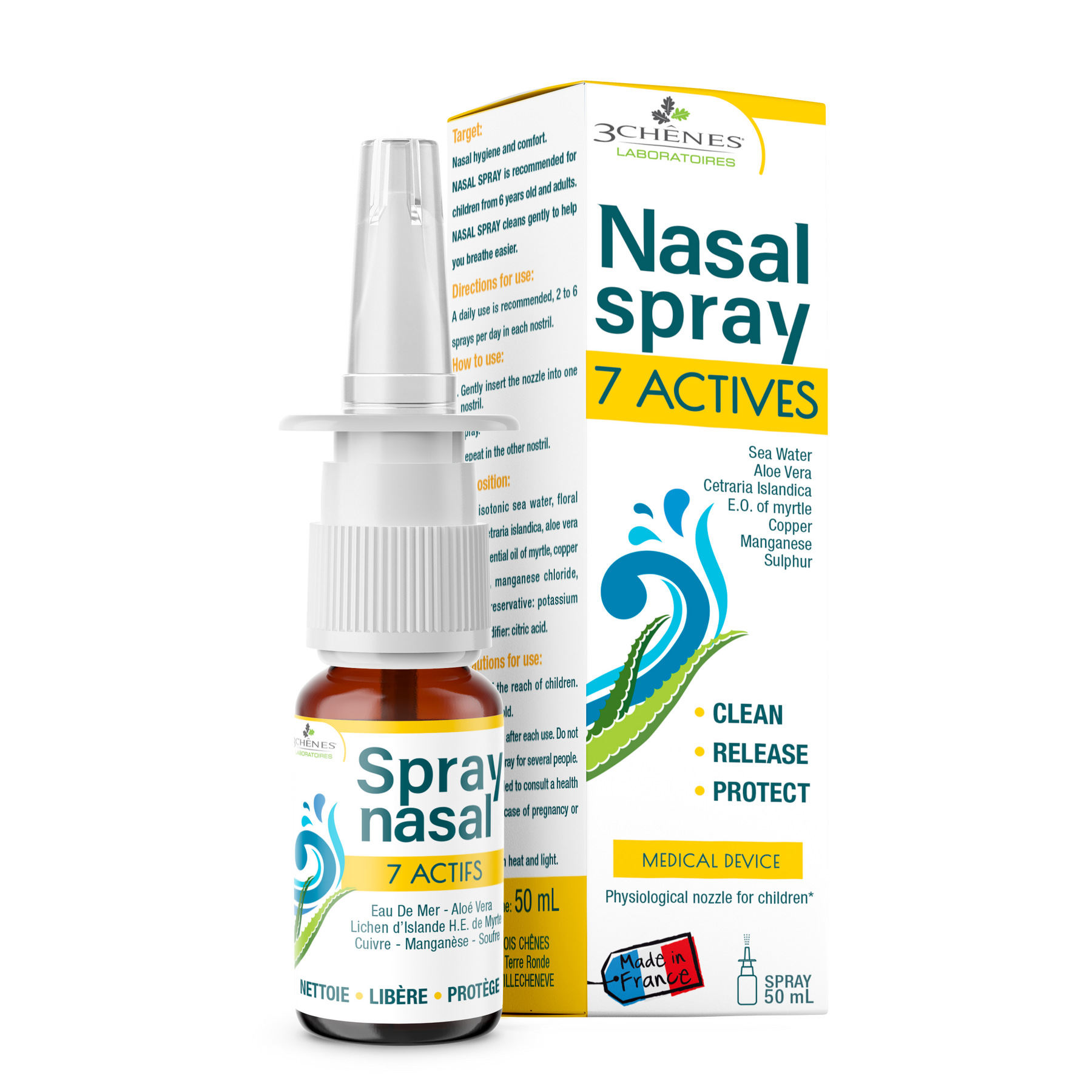 3 CHÊNES 7 Actives – ninasprei hügieeniks ja kaitseks. Ainulaadne 7 toimeainest koosnev valem merevee, Islandi samblavee, aaloe vera ekstrakti, mürdi eeterliku õli ja mineraalidega (vask, mangaan, väävel) aitab õrnalt niisutada ja puhastada ninakäiku. Mugav igapäevaseks kasutamiseks, eriti kui nina on tundlik kuiva või saastunud õhu suhtes. Sobib lastele alates 6. eluaastast.