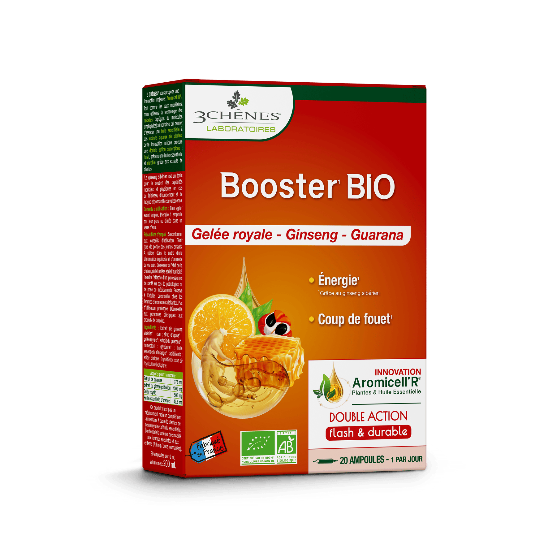3 CHÊNES Booster Bio – toidulisand normaalse ainevahetuse ja energia toetamiseks. Ženšenni ekstrakti, mesilaspiima ja pauliinia (guaraana) ekstrakti kombinatsioon koostises aitab säilitada normaalset kehakaalu ja rasvade ainevahetust. Siberi ženšenni ekstrakti kasutatakse sageli ka vereringe, immuunsuse, vaimse ja kognitiivse funktsiooni toetamiseks. Sobib sportlastele, taimetoitlastele ja lastele alates 12. eluaastast, gluteeni-, laktoosi- ja kunstlike lisaainetevaba. Innovatiivne Aromicell'R® tehnoloogia tagab pikaajalise toime.