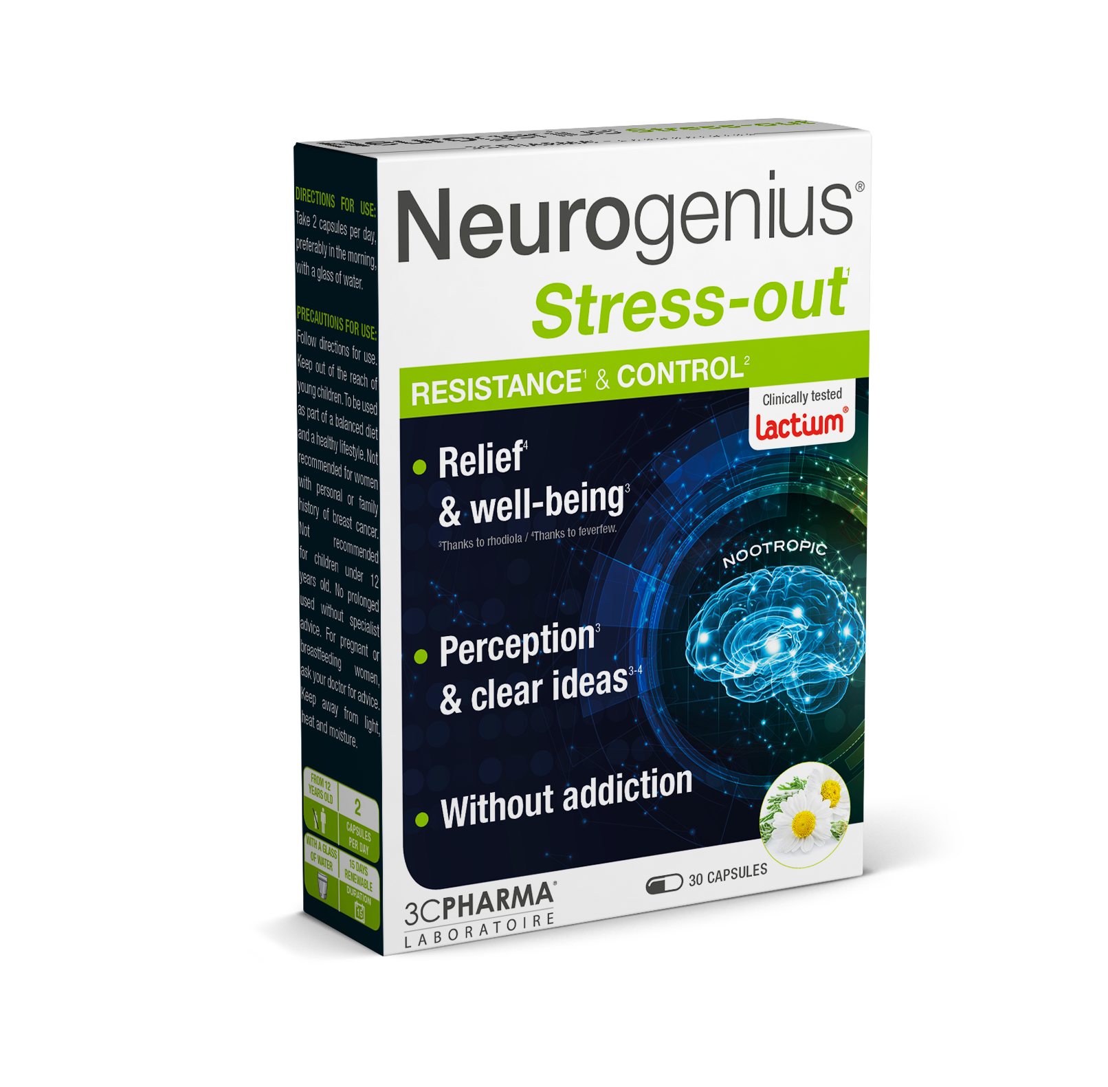 3C PHARMA Neurogenius Stress-Out on tasakaalustatud mikroelementide, vitamiinide ja taimeekstraktide kombinatsioon ärevuse ja stressi leevendamiseks, keskendumisvõime parandamiseks ning keha toetamiseks psühho-emotsionaalse pinge või energiapuuduse korral. Koostises sisalduv patenteeritud Lactium® aitab vähendada stressist tingitud psühho-emotsionaalset pinget, ärevust ja unetust. Basiiliku ja roosi radiola ekstraktid aitavad säilitada normaalset töövõimet ja emotsionaalset tasakaalu. See kombinatsioon võib olla kasulik ka mälu parandamise vahendina.